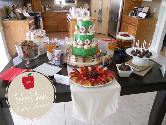 And as you can also probably tell, the theme was "school days." When people ask me where my brother and his fiance met, I often joke and respond, "the playground," but in their case it couldn't be closer to the truth. My brother and Mal met and became each other's first girlfriend and boyfriend in kindergarten (insert "sha" here). The relationship didn't last long (shocker), and ended with a pen to my brother's face in their elementary yearbook. :) Mal actually brought the yearbook to the shower to show how, at one point, she had scratched through and scribbled across sweet James' face. It was so great to have and people loved learning more about their history.